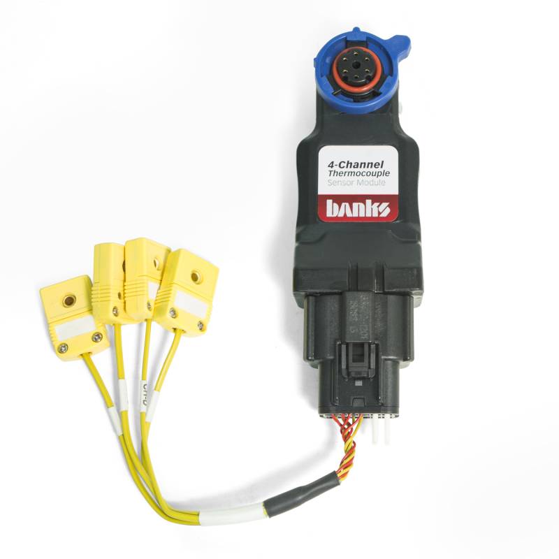 4 Ch Thermocouple Module Kit BanksBus compatible reciever Connects to your iDash to add 4 temperature inputs per module. Each channel can be configured to any temperature parameter and the k-type thermocouple sensor can read any temperature including EGTs as hot as 1800 deg F. The 4-Ch Thermocouple Module Connects to your iDash and adds 4 temperature inputs per module. Each channel can be configured to any temperature parameter and the k-type thermocouple sensor can read any temperature including EGTs as hot as 1800 deg F. Daisy chain up to 6 Thermocouple Modules and 6 Analog Sensor Modules per system allowing you to add over 48 new sensors to your Banks iDash DataMonster or SuperGauge.