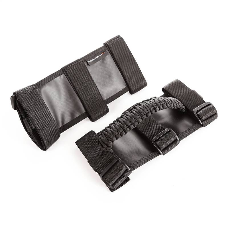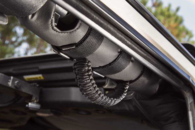 Rugged Ridge Paracord Grab Handles are constructed of durable 550 nylon parachute cord that is woven into a brawny 'Double Cobra' style knot that feels substantial in your grasp. Each handle secures to two OR three- in. diameter roll bars with heavy duty hook and loop straps for a firm and stable fitment. Your Jeep will love the attractive tactical styling, not to mention how much you'll love the assistance getting in and out of your rig! Paracord Grab Handles are available in a variety of color combinations, with one to suit any taste: Black on Black, Red on Black or Gray on Black. Sold in pairs.