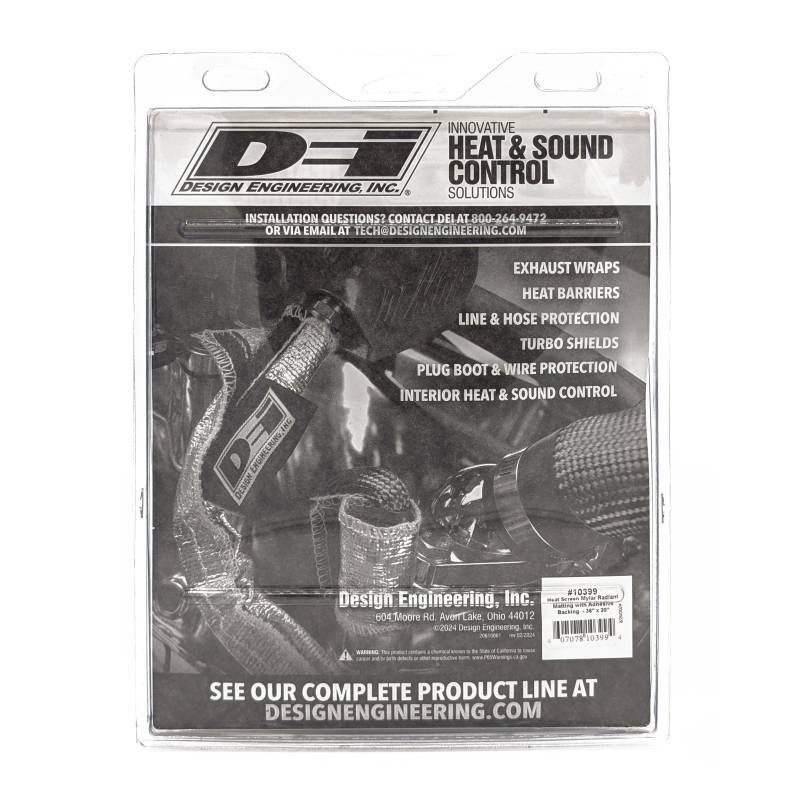 Heat Screen 36in x 20in w/Adhesive Heat Screen(TM) solves the problem of heat from engines and exhaust intruding into interiors and components. Heat Screen(TM) offers an excellent way to reflect radiant heat away from a vehicle's interior and because it's flexible and can be trimmed-to-size to protect against excessive heat sources. Constructed of a high temperature resistant fiberglass material, and with a thickness of only .060 in., Heat Screen(TM) features a thermal barrier on one side made of a superior reflective aluminized mylar surface, capable of withstanding direct heat up to 1200F. Heat Screen(TM) can be used to protect areas where excessive heat can blister paint, where exhaust pipes run close to the fuel tank, and has many other applications including floorboards, body panels, and under carpeting. DEI's Cool Tape(TM) is ideal for sealing and covering seams. Excellent protection for painted surfaces Withstands 1200F of direct heat Can be secured with adhesive or fasteners Trim to desired length DO NOT apply directly to exhaust components. Aluminized Surface Reflects Up To 2000 Degrees F Radiant /1200 Degrees F Direct Excellent Protection For Painted Surfaces Can Be Secured With Adhesive Or Fasteners Trim To Desired Length 36 in. x 20 in. Aluminized Mylar Radiant Matting