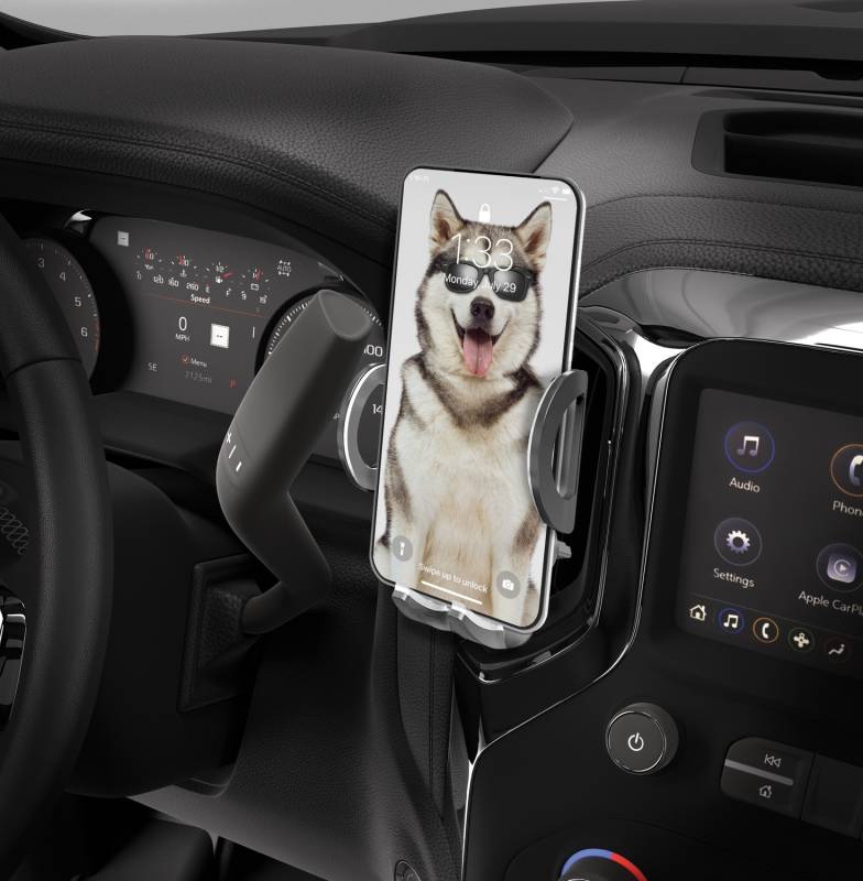 A convenient space for your phone’s charger port is located in its base. Just plug in and drive on.