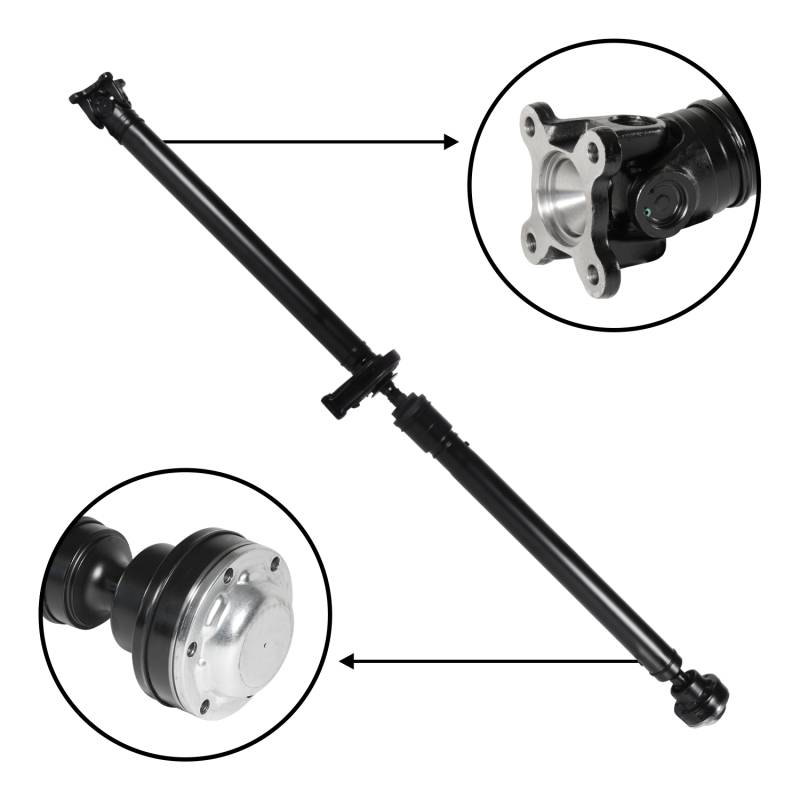USA Standard Gear Rear Driveshaft for GMC Acadia/Traverse/Enclave, Length 61.9” 2-piece rear driveshaft Nominal length 61.9" 60.8" to 63" length range 4-bolt flange at rear differential 6-bolt CV head at transfer case/ PTU