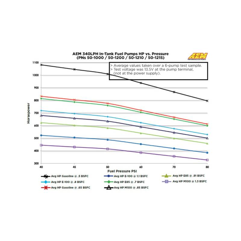 AEM's 340LPH E85-Compatible High Flow In-Tank Fuel Pumps feature robust internal construction that is designed to withstand the low lubricity characteristics of ethanol and methanol fuels, and are tested to work with ethanol fuels up to E100, methanol fuels up to M100 and all types of gasoline.\nThe AEM 340LPH E85-Compatible High Flow In-Tank Fuel Pump is designed for in-tank mounting on high performance naturally aspirated and forced induction vehicles. It features a compact 39mm diameter that fits most applications and an offset inlet design that eases installation.\nThe 340LPH E85-Compatible High Flow In-Tank fuel pump includes a wiring harness, pre filter, end cap and rubber buffer sleeve. Every AEM 340LPH E85-Compatible Fuel Pump is tested to flow 340 lph at 40 PSI before it is packaged for sale.\nTECHNICAL SPECS:\nWeight: 12.5oz (354grams)\nOutside Diameter: 39mm OD\nExternal Materials: Black plated steel with laser etching\nInlet Fitting: 7.7mm ID, 11.0mm OD. Offset Inline\nOutlet Fitting: 8 mm hose clamp. Offset\nPRV Activation: 80 PSI\nImpeller Design: Single Scroll Ceramic Turbine\nVOLTAGE SPECS:\nConnector Terminal: 6 mm Spade (pos/neg)\nMin Voltage Input: 6 volts\nMax Voltage Input: 18 volts\nCurrent Draw (40 psi): 12 amps (13.5v)\nCurrent Draw (80 psi): 15 amps (13.5v)\nFuse: 20 amps (13.5v)\n* Power rating given at 43 PSI, 13.5v at the pump terminal with a BSFC of .5. Flow capability for horsepower support is ultimately dependent on fuel hose diameter, and system electrical voltage and amperage capabilities.