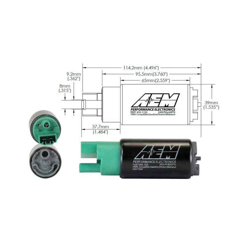 AEM's 340LPH E85-Compatible High Flow In-Tank Fuel Pumps feature robust internal construction that is designed to withstand the low lubricity characteristics of ethanol and methanol fuels, and are tested to work with ethanol fuels up to E100, methanol fuels up to M100 and all types of gasoline.The AEM 340LPH E85-Compatible High Flow In-Tank Fuel Pump is designed for in-tank mounting on high performance naturally aspirated and forced induction vehicles. It features a compact 39mm diameter that fits most applications and an offset inlet design that eases installation.The 340LPH E85-Compatible High Flow In-Tank fuel pump includes a wiring harness, pre filter, end cap and rubber buffer sleeve. Every AEM 340LPH E85-Compatible Fuel Pump is tested to flow 340 lph at 40 PSI before it is packaged for sale.TECHNICAL SPECS:Weight: 12.5oz (354grams)Outside Diameter: 39mm ODExternal Materials: Black plated steel with laser etchingInlet Fitting: 7.7mm ID, 11.0mm OD. Offset InlineOutlet Fitting: 8 mm hose clamp. OffsetPRV Activation: 80 PSIImpeller Design: Single Scroll Ceramic TurbineVOLTAGE SPECS:Connector Terminal: 6 mm Spade (pos/neg)Min Voltage Input: 6 voltsMax Voltage Input: 18 voltsCurrent Draw (40 psi): 12 amps (13.5v)Current Draw (80 psi): 15 amps (13.5v)Fuse: 20 amps (13.5v)* Power rating given at 43 PSI, 13.5v at the pump terminal with a BSFC of .5. Flow capability for horsepower support is ultimately dependent on fuel hose diameter, and system electrical voltage and amperage capabilities.