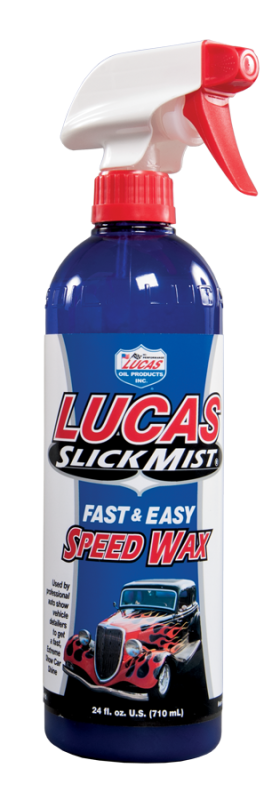 Slick Mist "Speed Wax" Lucas Slick Mist is a unique speed wax developed to quickly detail your car, motorcycle, ATV, truck, boat and airplane, and leave your paint with a showroom shine. Slick Mist is used by professional auto show vehicle detailers and racing professionals who demand the ultimate performance. Lucas Slick Mist is designed to be used on wet or dry surfaces, even in direct sunlight, and provides excellent UV protection. Excellent for all vinyl wraps and decals, and helps keep mud, bugs and tar from sticking to your vehicle. Safe for use with leather, plastic or aluminum surfaces. For best results, shake bottle well prior to use, apply a fine spray and wipe dry with a soft terry cloth towel, chamois or micro fiber towel.
