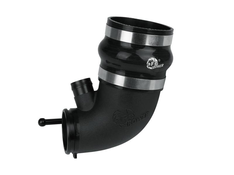 This turbo inlet is the perfect addition to your aFe air intake system. It removes restriction of the factory turbo inlet and guarantees increased air flow for maximum power. It provides a smooth transition for the air from the aFe air intake tube to the turbo with minimum restriction. The cast aluminum design has CNC machined ends for a perfect fit and finish. The part is anodized black for durability and a stealthy appearance. This turbo inlet utilizes a flexible silicone coupling that is reinforced with two layers of polyester material, making it resistant to wear and deterioration. The silicone coupling mates directly to the aluminum turbo adapter and the aFe air intake tube. All necessary clamps are provided. This turbo inlet utilizes the factory O-Ring and screw and comes with the necessary clamps and coupler to fit perfectly with your aFe air intake system.