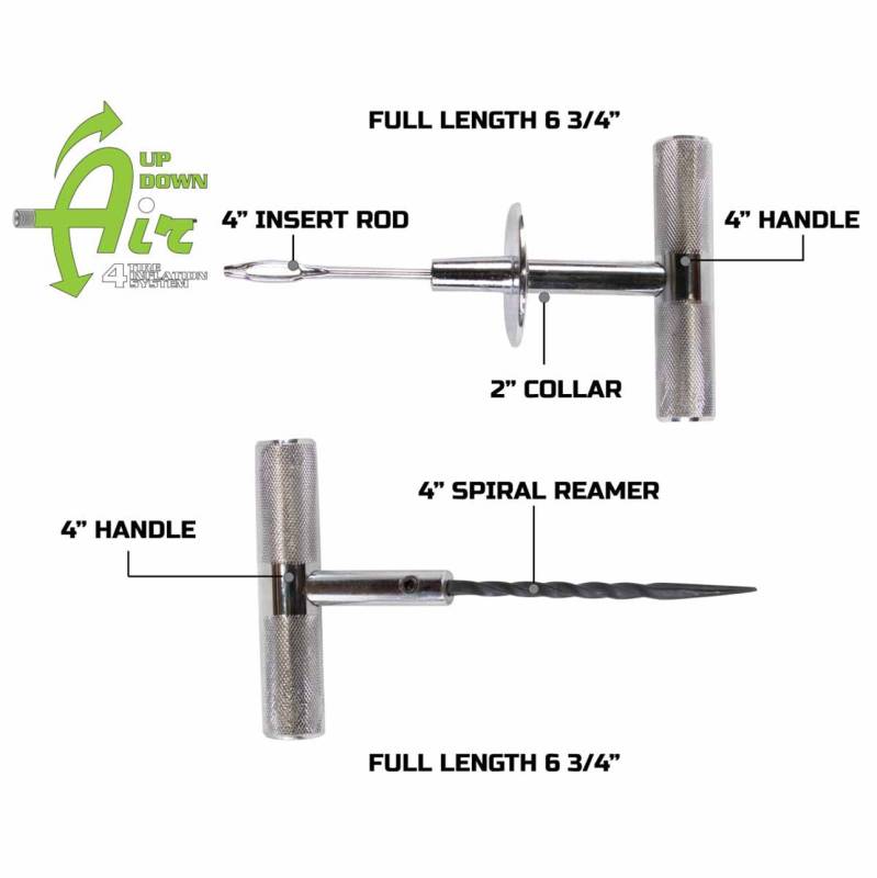We start off with a 7.75 extra-long plug that can be used for the most extremely applications like a heavy-duty off-road tire or can be trimmed to accommodate a passenger car tire. This kit gives you flexibility either way and your better off having more than not enough. Included. 20 Extra Long Vulcanized Plugs which is plenty, 6.75 Reamer, 6.75 Probe With Hand Guard, Heavy Duty Extended Needle Nose Pliers, 8.75 Full Extended Air Gauge, Automotive Grade Lubricant, Pencil Style Dual Valve Repair Kit Storage Box which has Four Chrome Caps, Four Plastic Caps, Four Valve Cores, Four Tire Deflators & one Four Way Valve Tool, two Allen keys and fits nicely in a high Impact Storage Case. Warranty. All Up Down Air off road tire repair kits come with a lifetime warranty and a money back guarantee.