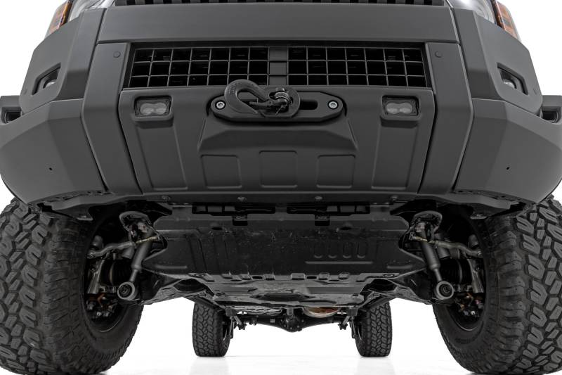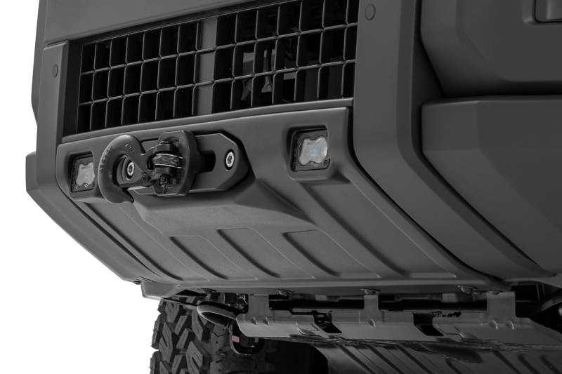 - Heavy-Duty Winch Tray: Built from 7-gauge steel for maximum strength and durability. Heavy-Duty Accessory Mounts: Constructed from robust 11-gauge steel for long-lasting strength and reliable support for aftermarket accessories. Includes Front Fascia Replacement: Features a new front fascia designed to seamlessly replace the factory unit for a clean, OEM-style appearance. Winch Control Extension Included: Provides added flexibility and ease of use with the included winch control extension harness. Hassle-Free Installation: Bolt-on structural design simplifies the mounting process. Winch-Ready Design: Engineered for seamless compatibility with Rough Country's PRO9500S and PRO12000S winches. Integrated RC LED Fog Lights: Kit includes a pair of 3x1.75 Rough Country LED fog lights for enhanced visibility and a sleek integrated look. Selectable Light Color Output: Choose between bright white (4800 lumens/pair) or amber yellow (4000 lumens/pair) to suit your driving conditions..