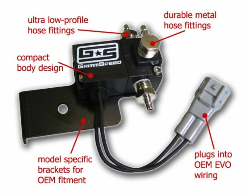 The GrimmSpeed™ Mitsubishi EVO Boost Control Solenoid is designed to work with your factory computer (requires tuning). It will not reduce the life of your factory computer because it is designed to draw the same ammount of power as the factory BCS but flows better and reacts faster. It plugs in and requires no splicing or soldering of resistors. With the included bracket you can bolt it in, plug in the connector, and start tuning for fast boost response, increased boost pressure and free up lots of power. Planning on returning the car to stock? Just reverse installation.