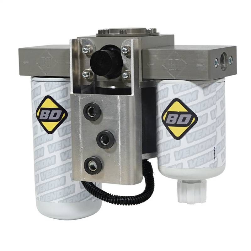 BD Venom Cummins Fuel Lift Pump c/w Filter & Separator - Dodge 6.7L 2013-2022 The Venom line was developed to replace our FlowMax line with improved max flow rate and better flow control. This pump provides enough fuel flow to support up to 900hp. Unlike typical ball and seat style regulators, our new diaphragm style pressure regulator makes this pump more efficient and helps maintain fuel pressure as flow demand increases. This upgraded pump maintains high fuel pressure, even at high flow, which helps prevent premature injection pump failure by reducing wear. The Venom design supports the gerotor using sealed ball bearings to maintain smooth, reliable operation. A rigid aluminum bracket along with vibration isolators allow for versatile and easy installation. 1-1/8in diaphragm-based fuel pressure regulation Preset 15-18 psi Updated pump mounting bracket Includes commonly sourced water separator & fuel filter 165gph supports from stock up to 900hp