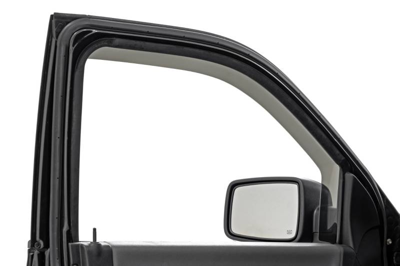 Upgrade your driving comfort with Rough Country's premium in-channel wind deflectors, designed for easy installation and exceptional performance. They fit seamlessly into your vehicle's window channels maintaining a sleek profile while letting you enjoy fresh air in any weather. Say goodbye to noisy wind and turbulence for a quieter cabin on city commutes or road trips. Our deflectors reduce glare and keep your interior dry with windows cracked open. They blend seamlessly with your vehicle's design for a stylish look and are custom-made for a perfect fit and reliable performance, ensuring every drive is comfortable and enjoyable.