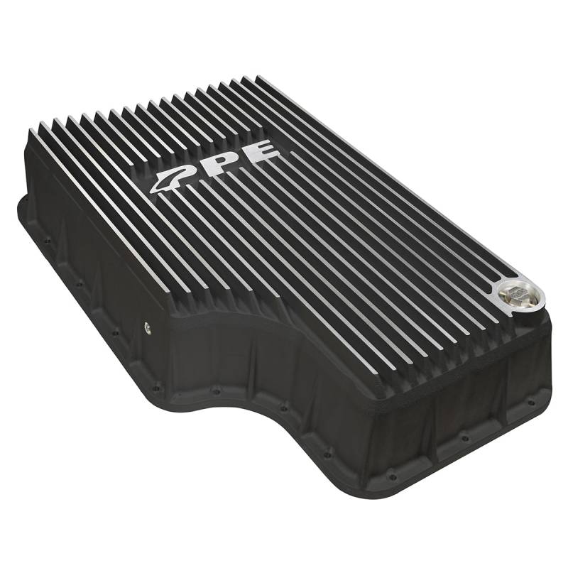 PPE's cast aluminum, high-volume transmission pan is engineered to be a direct bolt-on replacement to the stock-stamped steel pan. This easy upgrade has a 5-inch depth and holds 14 quarts of fluid - that's 7 quarts more than stock. The internal heat sinks channel oil and prevents sloshing. The Deep external fins radiate heat to keep fluid temps down. Thick side gussets add strength and provide rigidity.