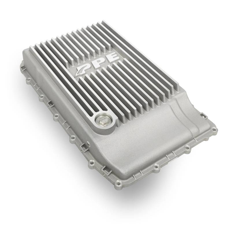 PPE's cast aluminum pan provides superior cooling over the stock plastic pan. The stock plastic pan has no drain plug and the pan is discarded after each transmission service. The PPE Pan's cast-aluminum construction with exterior fins transfers heat away from transmission internals.