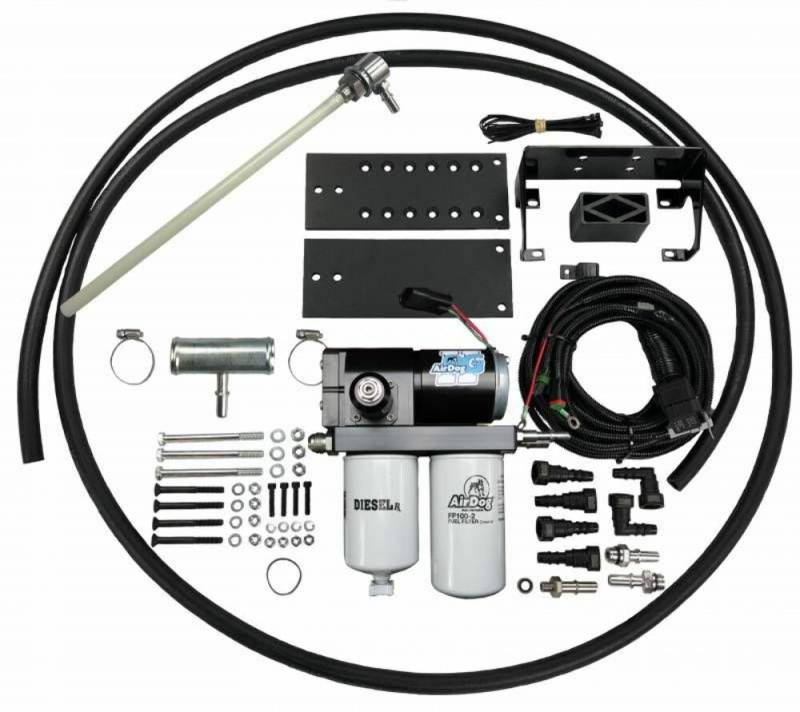 This is the AirDog II-5G DF-100 fuel system for the 1998.5-2004 Dodge Ram VP-44 and early CP3 5.9L Cummins WITH the in-tank fuel pump. This diesel lift pump mounts to the frame rail using the supplied sandwich plate mounting system. A Fuel Module Upgrade Kit is installed in the factory fuel basket to pull fuel through a factory-style 1/2" bulkhead fitting. This will bypass the factory in-tank lift pump. The pressure side connects directly into the side of the injection pump, bypassing the factory fuel filter housing. The AirDog Air/Vapor return is sent back to the tank through the factory 3/8” suction line once the module is modified This is a 100GPH (Gallon Per Hour) lift pump system for stock fuel trucks.